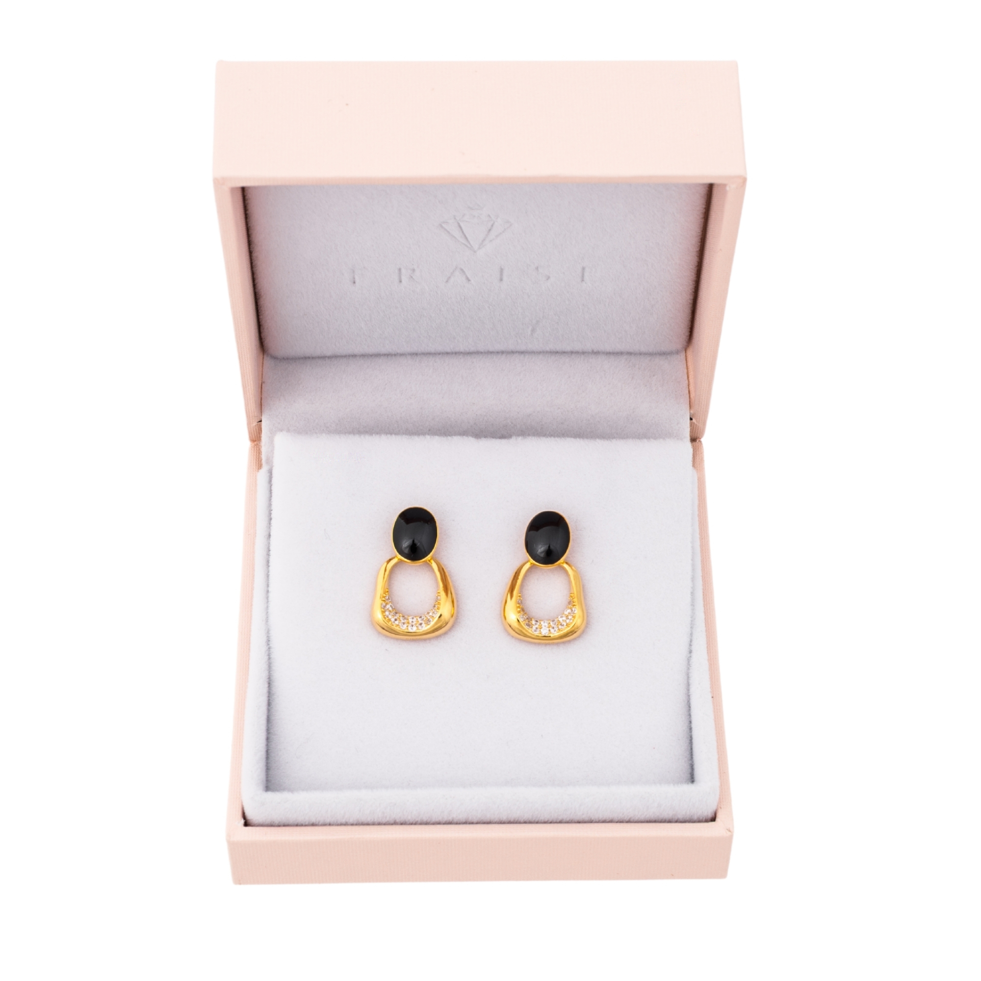 Eleganckie kolczyki marki Fraise, które łączą klasyczną formę z nowoczesnym wykończeniem. Kontrast czarnej emalii z pozłacanym srebrem oraz subtelny blask cyrkonii tworzą ponadczasową biżuterię, idealną zarówno do codziennych stylizacji, jak i na wyjątkowe okazje.