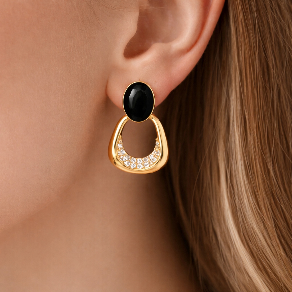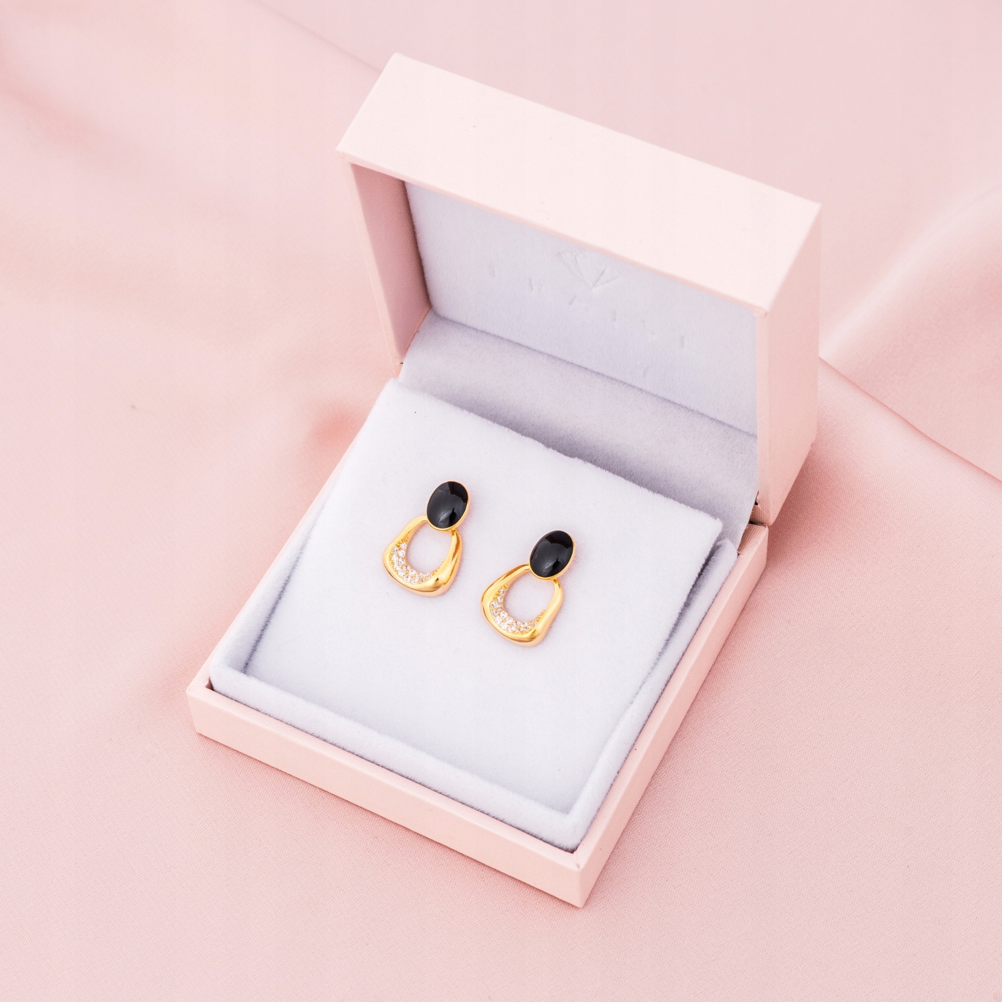 Kolczyki wykonano z wysokiej jakości srebra próby 925, pokrytego warstwą złota, co nadaje im luksusowy wygląd i podkreśla ciepły odcień metalu. Górny element zdobiony jest gładką, czarną emalią, natomiast dolna część została ozdobiona drobnymi cyrkoniami, które pięknie odbijają światło i dodają całości elegancji.