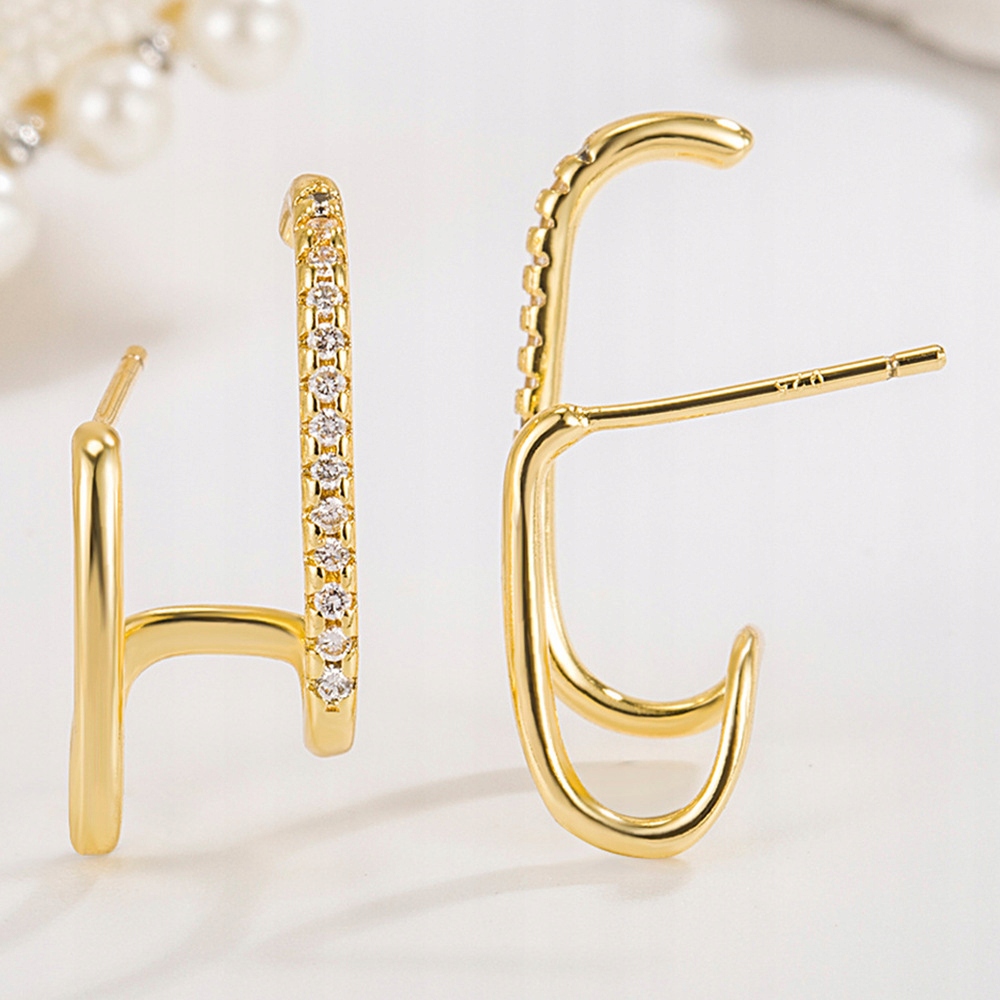 Stylowe i nowoczesne srebrne, podwójne kolczyki pozłacane 14 karatowym złotem to wyjątkowy dodatek dla miłośniczek elegancji z nutą oryginalności. Wykonane z wysokiej jakości srebra i pokryte warstwą złota, zachwycają swoim blaskiem i trwałością. Zdobione połyskującymi cyrkoniami, które dodają im wyrafinowanego uroku, stanowią doskonały wybór zarówno na co dzień, jak i na wyjątkowe okazje. Podwójny design nadaje im nowoczesnego charakteru, czyniąc je idealnym dodatkiem do każdej stylizacji.