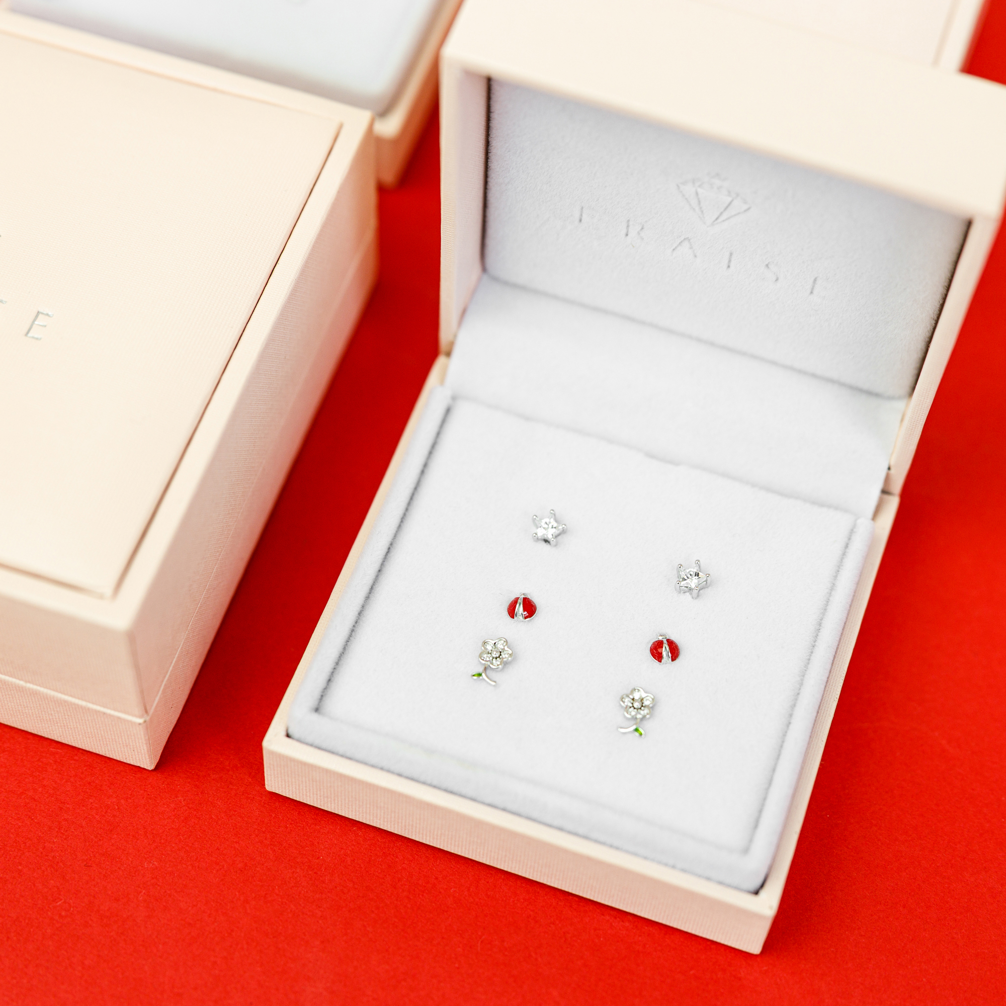 Kolczyki zapakowane są w eleganckie pudełko z logo FRAISE, idealne na prezent dla ukochanej osoby lub jako upominek dla samej siebie.