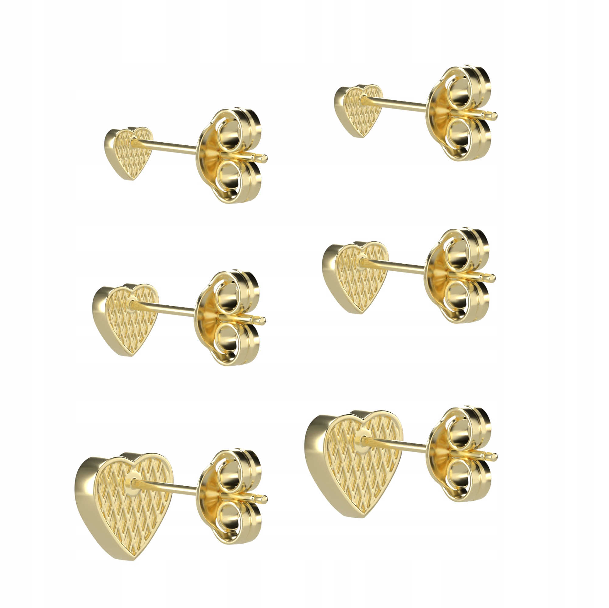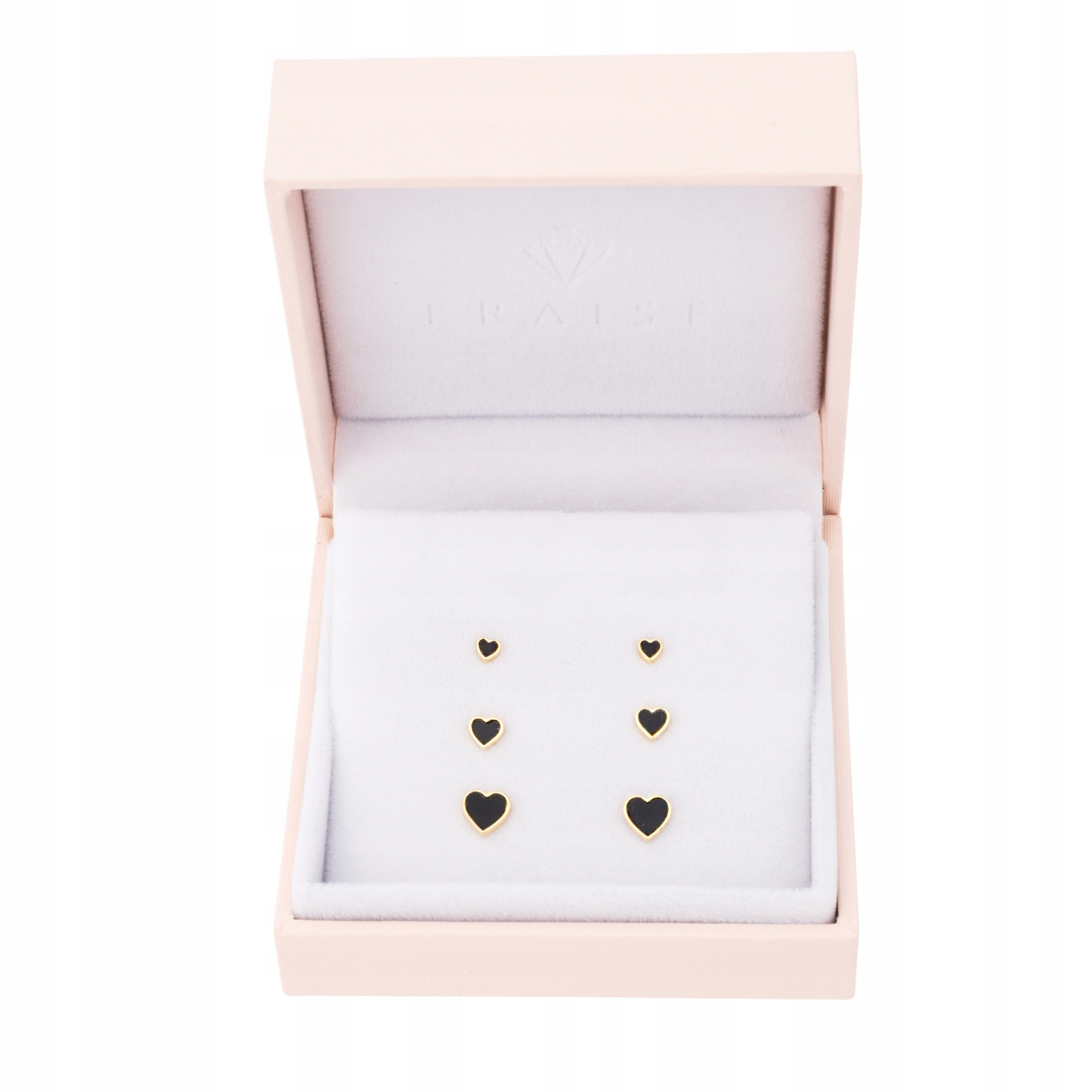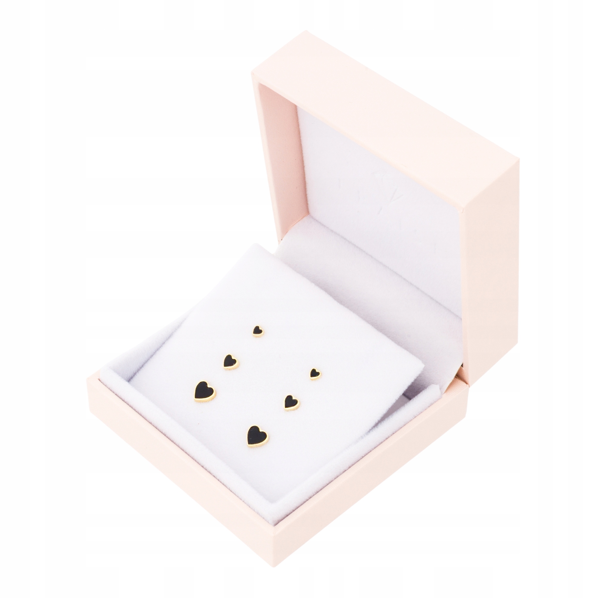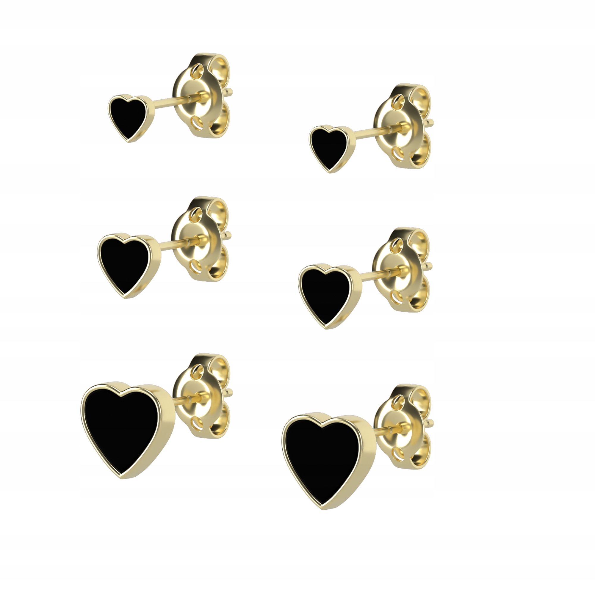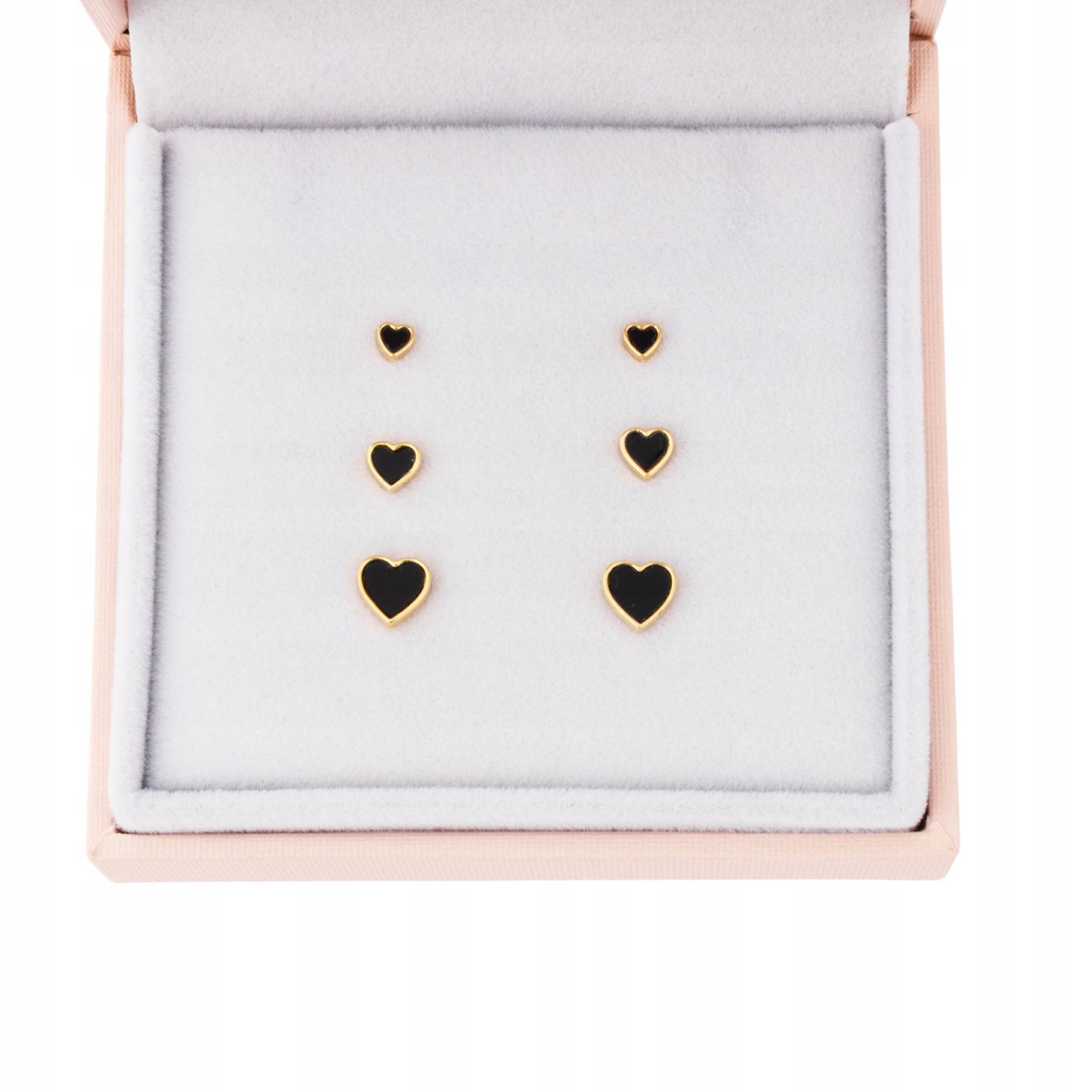 Design: Trzy pary kolczyków w kształcie serc o różnej wielkości, wypełnione czarną emalią: