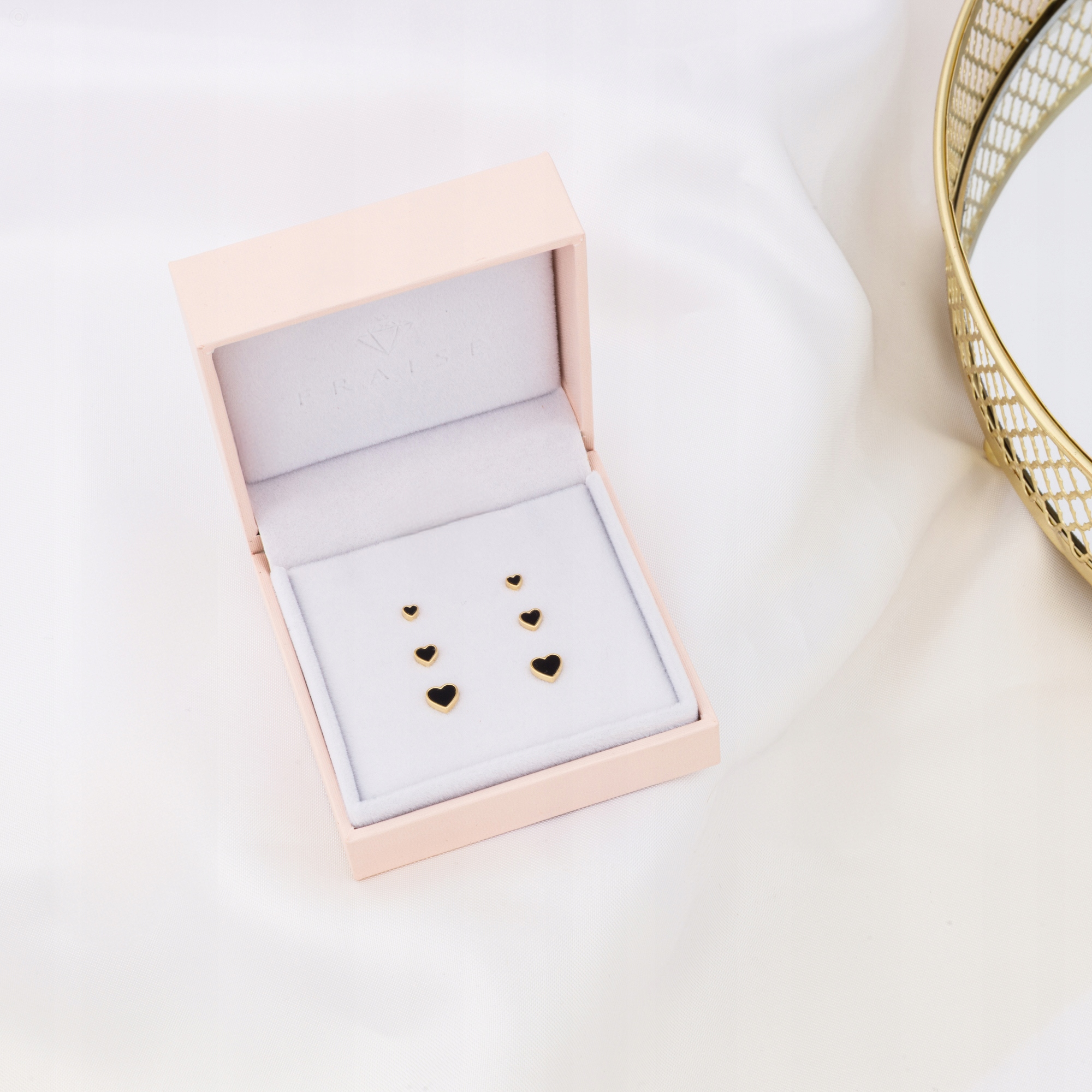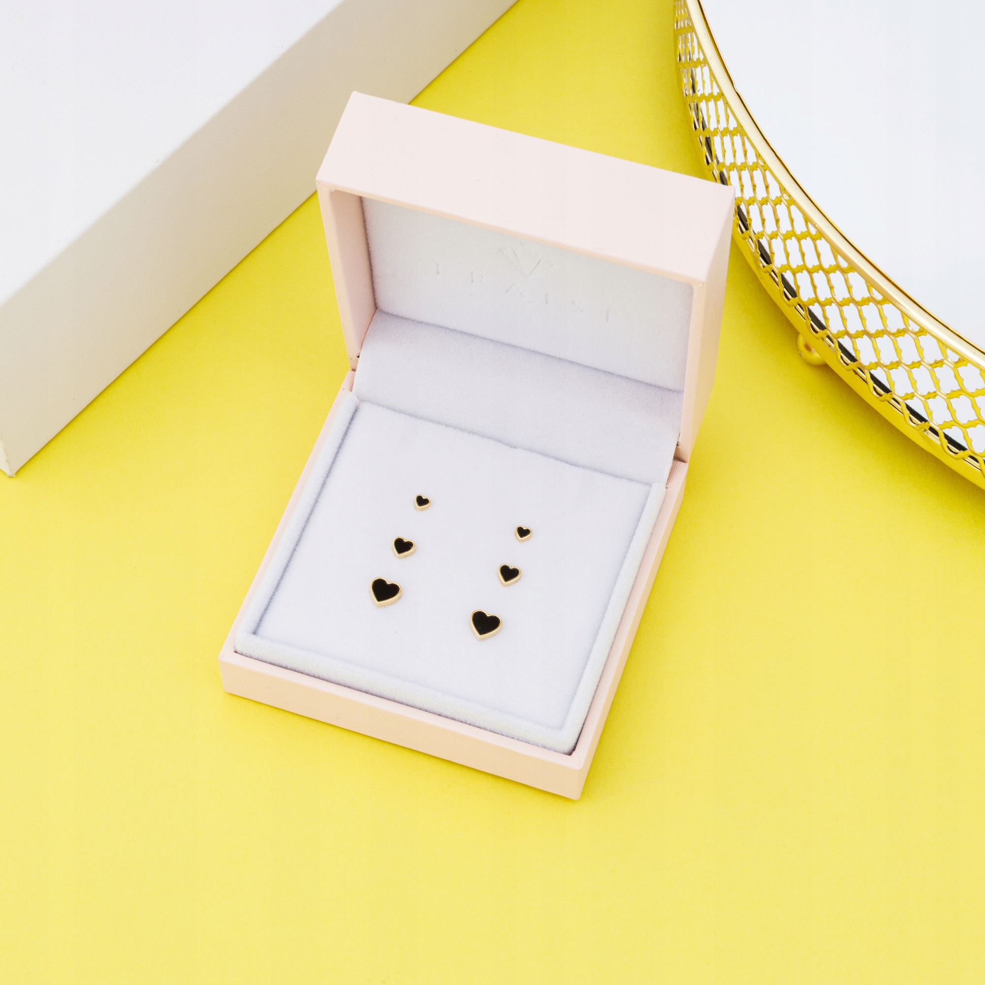 Elegancja w minimalistycznym wydaniu! Zestaw pozłacanych kolczyków FRAISE z czarnymi sercami to idealny wybór dla kobiet ceniących ponadczasową klasykę z nutą nowoczesności.